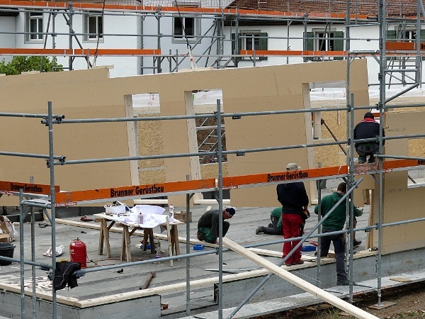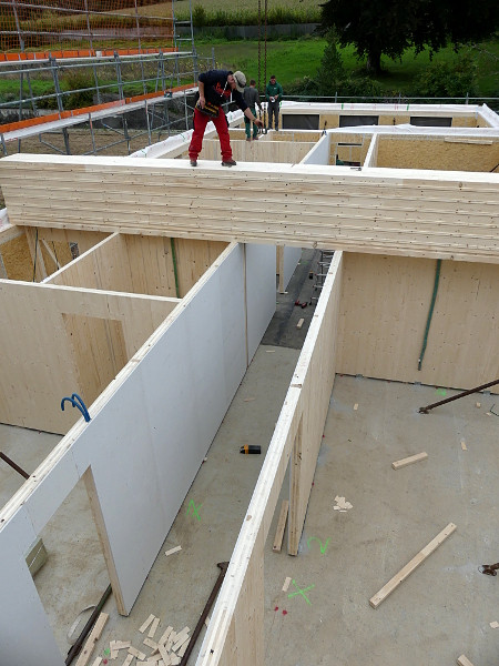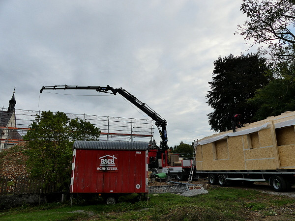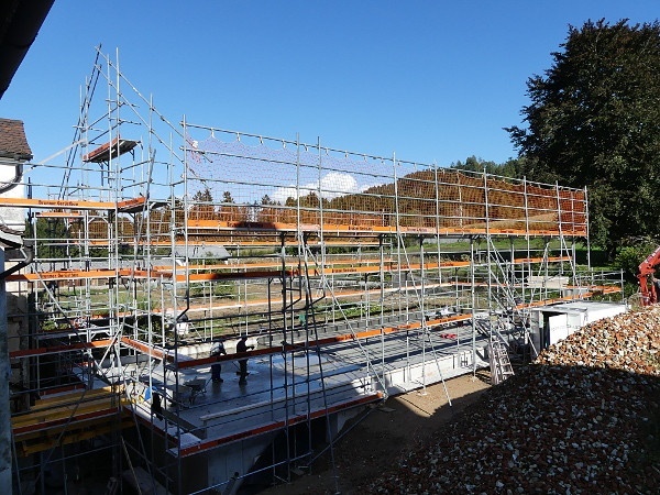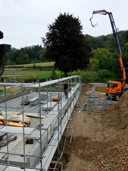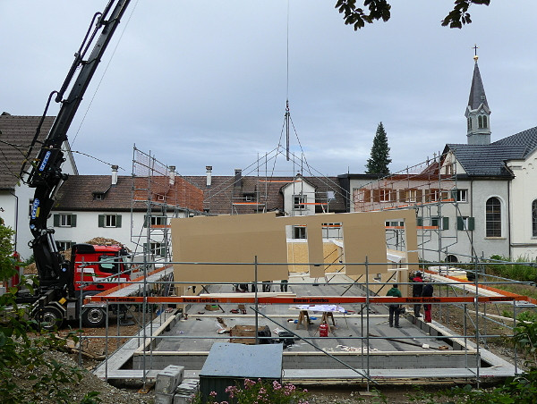Faszinierend! Der Fortschritt der Baustelle ist beeindruckend. Alles geht flott und zügig voran. Auch bei nicht ganz so optimalem Wetter wird gearbeitet und mit vollem Einsatz die Baustelle vorangebracht. Es ist aufregend zuzuschauen. Wie ein überdimensionales 3D-Puzzle mutet das Aufstellen der Wände an. Das Erdgeschoss steht bereits. Innerhalb eines Tages steht ein ganzes Stockwerk! Es ist und bleibt eine große Freude für uns mitzuerleben, wie dieses Gebäude entsteht. Und mit welcher Effizienz und Einsatzfreude die Arbeiter an ihr Werk gehen.