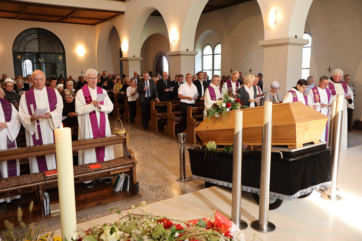 Am Samstag, dem 31.08.2024, haben wir den Auferstehungsgottesdienst mit Beerdigung von unserer Äbtissin M. Hildegard begangen. Viele, viele Menschen kamen aus nah und fern, um mit uns unserer langjährigen Äbtissin die letzte Ehre zu erweisen. Ein Begräbnis ist ein trauriger Anlass. Und doch war es ein Fest der Wertschätzung gegenüber Mt. Hildegard; ein Fest des Glaubens an die Auferstehung; und ein Fest der Gemeinschaft, des Zusammenkommens und des Miteinanders. Das hätte Mt. Hildegard gewiss gefallen.