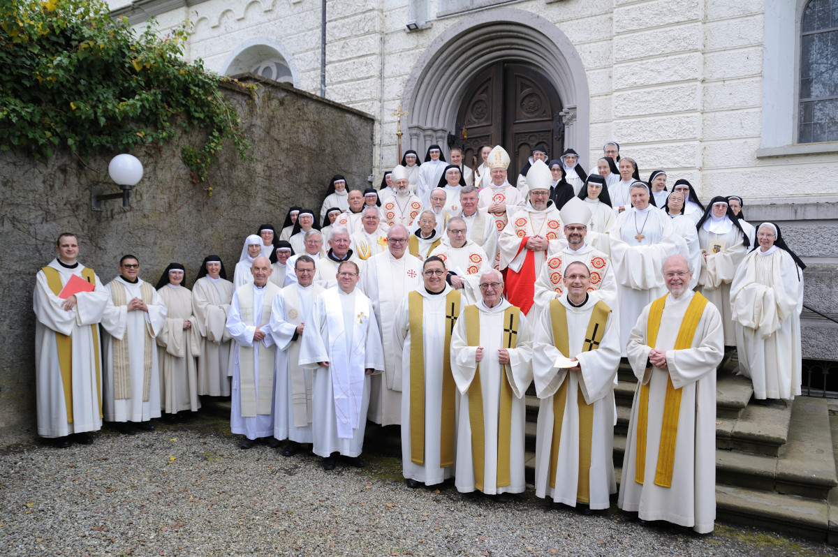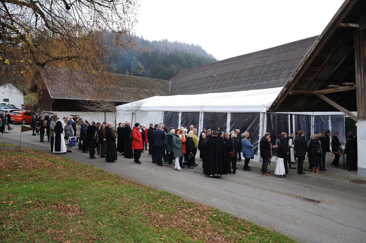 Ein besonderer Tag, der 9. November 2024! Am Fest der Kirchweihe der Lateranbasilika und unserer Klosterkirche empfing Äbtissin Maria-Stella die Benediktion durch unseren Herrn Generalabt Mauro-Giuseppe Lepori OCist. Viele Gäste waren gekommen, um dieses große Fest mit uns zu feiern. Bischof Benno Elbs stand dem Gottesdienst vor. Viele Priester aus dem Ländle, Äbte und Äbtissinen aus unserem Orden, Brüder und Schwestern aus verschiedenen Gemeinschaften und viele, viele Menschen aus nah und fern füllten unsere Kirche. Eine besondere Freude war es unserer Äbtissin, das ihre gesamte Familie aus Niederösterreich gekommen war, um diesen besonderen Tag mit ihr zu begehen. Der festliche Gottesdienst wurde mitgestaltet durch den KornmarktChor unter der Leitung von Wolfgang Schwendinger, Mark Casey an der Orgel, und Miriam Mairinger und Franziska Krimmel mit Flöte und Violine - beides Nichten von Sr. Maria-Stella. Im Anschluss nach dem feierlichen (und langen) Gottesdienst feierten wir bei der Agape im Klosterhof weiter, im beheizten Zelt konnte man sich wieder aufwärmen und es sich gemütlich machen.