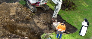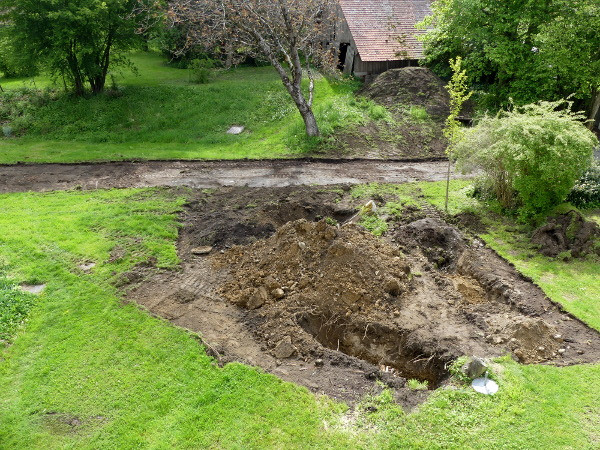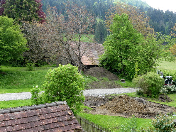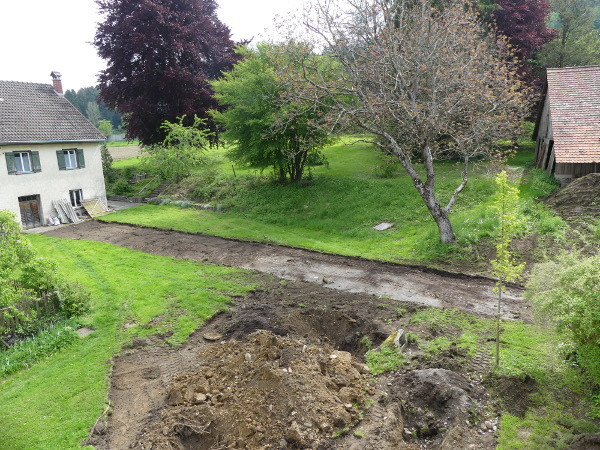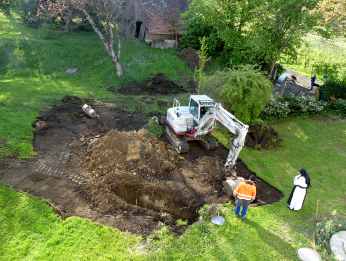 Nun gehen wir bereits auf den Juni zu, und doch sieht es so aus, als ob sich nichts tut in Sachen unseres Noviziats-Neubaus. Viele Sitzungen, Besprechungen, Planungen, Behördenwege, usw. haben wir in den vergangenen Monaten hinter uns gebracht. Und jetzt ist es soweit. Es geht los! Am 16. Mai wurde die Baustraße errichtet. Es handelt sich um eine Zufahrt zur Baustelle, die es den großen Maschinen der Baufirmen ermöglicht, überhaupt die Baustelle zu erreichen - ohne dabei im Gras zu versinken. Eine Sorge bereitete uns hierbei ein alter Keller, von dem wir nicht genau wussten, wie weit er unterirdisch an die Baustraße heranreichen wird.