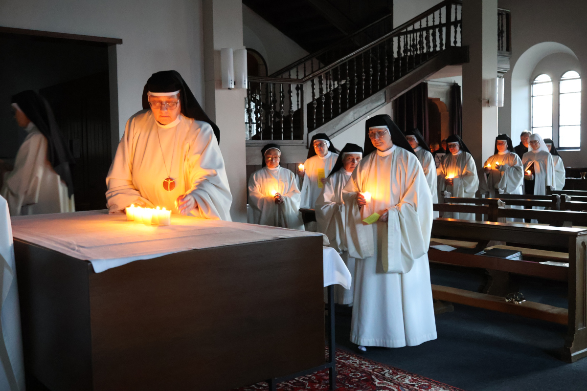 Das Hochfest Darstellung des Herrn, im Volksmund Mariä Lichtmess, 40 Tage nach Weihnachten gedenkt der Darstellung des Jesusknaben im Tempel von Jerusalem. Es ist damit der letzte Weihnachtsfesttag, auch wenn wir schon mitten im neuen Jahr sind. Wir haben uns mit einer Lichtvesper auf dieses schöne Fest eingestimmt. Jesus, das Licht der Welt, will uns Licht und Leben sein. In der Lichtvesper haben wir das Licht von der Krippe empfangen und es in einer Prozession an den Altar getragen, wo wir im Stillen unsere Gelübde erneuert haben. Dieses Licht Christi, das unsere Kapelle erleuchtet hat, möge in unseren Herzen brennen, für ihn, für die Menschen, und ausstrahlen in die Welt hinein.