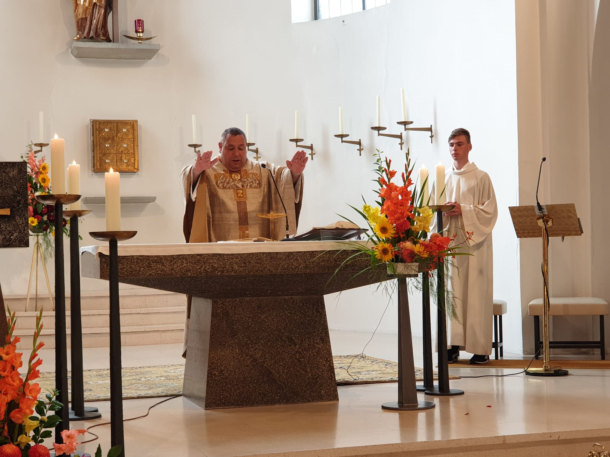 Am 5. August hatten wir die Freude, mit Kaplan Wolfgang Ehrle Nachprimiz in unserer Klosterkirche zu feiern. Gebürtig aus Niederstaufen, also unserer deutschen Nachbarschaft, hat Kaplan Ehrle einen Auftrag in unserer Paramentik getätigt. So haben wir ihn kennengelernt. Wir haben uns sehr gefreut, das er die Einladung, bei uns eine Nachprimiz zu feiern, angenommen hat. Nach dem Gottesdienst konnten wir beim Frühstück ein wenig mit dem frischgebackenen Priester plaudern und ihn noch besser kennenlernen. Wir haben ihm unser begleitendes Gebet für sein Wirken versprochen, und freuen uns, wenn wir ihn wieder einmal in unserem Hause begrüßen können.