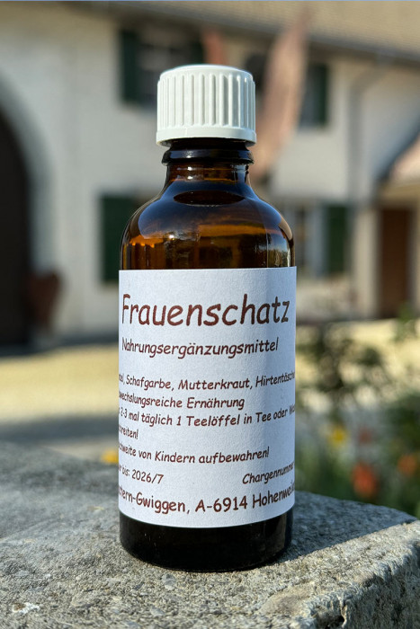 Silbermantel-, Schafgarbe-, Mutterkraut- und Hirtentäschelextrakte in 38 % Alkohol 55 ml, braunes Glasfläschchen mit Tropfverschluss.