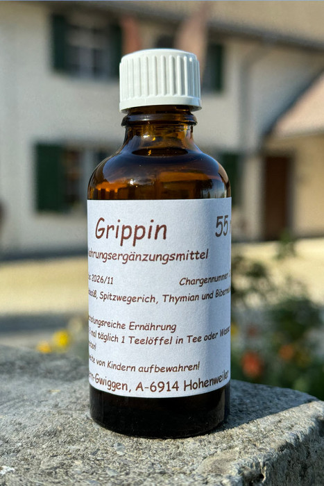 Holunder-, Mädesüß-, Spitzwegerich-, Thymian- und Bibernellwurzextrakte in 38 % Alkohol 55 ml, braunes Glasfläschchen mit Tropfverschluss.